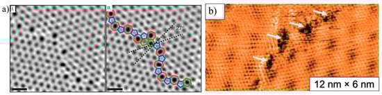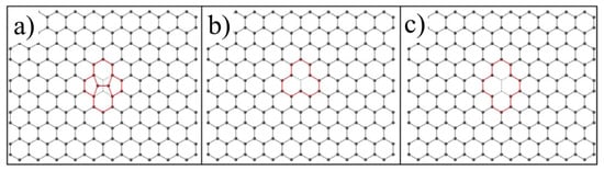 Atomic vacancies disrupt linear atomic arrangement in 2D materials and create dangling or undercoordinated bonds (Figure 6) [109]. Subsequently, the saturation of dangling bonds by the Jahn–Teller geometric distortion forms different polygons in a 2D material [110]. Experimental studies have reported that Stone–Wales (SW) defect, di-, tetra-, hexa-, and even up to deca-vacancies can be present in 2D materials [89,111,112]. Stone–Wales (SW) defect is a widespread topological defect, which is mostly present in grain boundaries. Unlike an atomic vacancy, a Stone–Wales defect does not occur due to missing atoms from the lattice; rather, it originates from the 90° rotation of π-bonded atomic pairs and consequently forms adjacent heptagons and pentagons. A Stone–Wales defect has low formation energy in graphene, and therefore such defects can easily be observed in graphene [113]. Conversely, contrary to theoretical predictions, Stone–Wales defects have not been found experimentally in hBN [114,115,116,117].