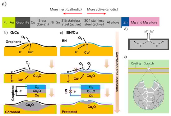 (a) Electrochemical potential sequence of various materials; (b) schematic diagrams for galvanic coupling of graphene and hBN-coated Cu. Graphene galvanically couples Cu and oxygen that increases corrosion, whereas, hBN shows no galvanic coupling; (c) pitting corrosion due to a galvanic coupling of two different metal featuring a large ratio of cathodic to the anodic area corresponding to higher corrosion current; (d) and (e) Corrosive species attacking and propagating through grain boundaries of anodic metal (exposed due to scratch) and reducing material strength rapidly. Adapted with permission from ref. [137]. Copyright 2017 Springer Nature Limited. And adapted under Creative Commons Attribution-NonCommercial 3.0 Unported Licence from ref. [70] —Published by The Royal Society of Chemistry.