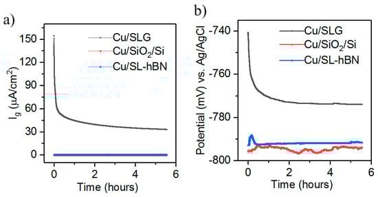 On the contrary, in hBN, the different electronegativity of nitrogen (i.e., 3.04) and boron (i.e., 2.04) atoms create localized π-electrons near nitrogen. Thus, hBN is inherently insulating and does not induce galvanic corrosion. A comparative experimental study between SLG and SL-hBN (i.e., single-layer hBN) on Cu showed that hBN can reduce the galvanic corrosion by nearly 400 times [49]. The galvanic corrosion current density (Ig) and galvanic potential showed a peak during the initial stage of corrosion for SLG (Figure 10a,b). The corrosion current was found to be significantly lower for an SL-hBN coating, indicating lower corrosion (Table 2). In addition, the galvanic potential of Cu/SLG (i.e., −744 mV) is higher than Cu/hBN (i.e., −792 mV), indicating the more cathodic nature exhibited by graphene.
