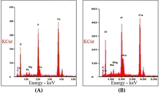EDS analyses showed that PGPT particle element weight (wt %) contained 37.19 ± 4.93 wt % calcium, 34.37 ± 8.38 wt % oxygen, 17.19 ± 1.79 wt % phosphorus, 4.75 ± 4.36 wt % gold, 4.54 ± 2.62 wt % carbon, and 0.60 ± 0.10 wt % magnesium. By comparison, elemental concentrations in porcine control particles had less calcium with only 30.69 ± 4.11 wt % (p < 0.05), 15.03 ± 0.38 wt % phosphorus (p < 0.05), 31.13 ± 6.98 wt % oxygen, and 1.13 ± 0.17 wt % sodium compared to the plasma-treated porcine particles. The porcine control had a higher level of carbon (6.02 ± 6.49 wt %), magnesium (1.28 ± 0.95 wt %), and gold (14.72 ± 2.76 wt %). The Ca/P ratio in the PGPT particles was 2.16, higher than the hydroxyapatite (HA) value. In contrast, the Ca/P ratio of the porcine control was 2.04, with a statistically significant difference between both Ca/P ratios (p < 0.05) (Table 1, Figure 2).