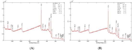 XPS analysis supported the EDS results and indicated that PGPT values were in concordance with Seo et al. who fabricated HA bioceramics from recycled pig bones by heating to 1000 °C. The HA was composed of calcium, phosphate, carbon and magnesium ions in similar percentage concentrations as the present study’s results [31]. In the present study, the Ca/P ratio for the PGPT particles was 2.16, higher than the HA value. In contrast, the Ca/P ratio of the porcine control was 2.04, with a statistically significant difference between both Ca/P ratios (p < 0.05). (Table 1, Figure 2) Both Ca/P ratios correspond to high crystalline apatite particles [32,33]. The PGPT higher Ca/P ratio over porcine control (p < 0.05) can be directly related to the low-temperature Argon plasma treatment. The Ca/P ratio of both porcine grafts in the present study was higher than the one found by other authors. This can be attributed to the lower temperatures used during the porcine graft preparation in the other studies [31,34].