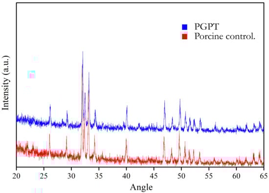 Powder X-ray diffraction (XRD) was used to analyze the crystalline structures and chemical compositions of PGPT and porcine controls. Diffraction patterns were collected on a PANalytical X’Pert3 Pro system (X’Pert3 Powder, PANalytical Co. Ltd., Almelo, The Netherlands) operated at 60 kV and a 45 mA current with Mo Kα (0.71073 Å) source. Samples were scanned over a range of 10° ≤ 2θ ≤ 70°.