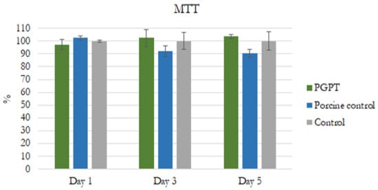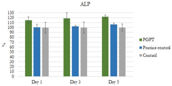 During the time-dependent analysis, the PGPT exhibited higher ALP activity. Significantly greater differences were observed with PGPT than with the non-treated porcine particles and controls on days 3 and 5 (p < 0.05) (Figure 7).