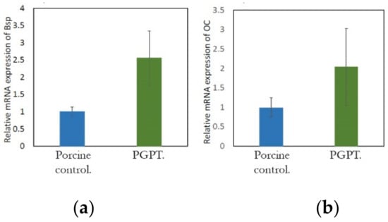 After 5 days, the results of real-time PCR revealed that cells cultured with PGPT and porcine control, compared with the control cells, had elevated Bsp and OC genes. In addition, cells cultured with PGPT had a higher relative mRNA expression for both genes than did the cells cultured with porcine control (p < 0.05) (Figure 8). To the best of our knowledge, this is the first time that bone sialoprotein and osteocalcin genes have been measured in cells cultured with PGPT. For a better understanding of the porcine bone graft bio-physical surface treatment results within osteoblast-like cells, further analyses of these genes, together with other genes, are necessary.