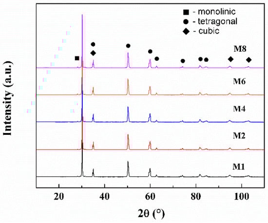 As presented in Figure 1, YSZ coating consists of the monoclinic, tetragonal, and cubic phases. The phase content of each sample is shown in Table 2. The thermal conductivity of the monoclinic phase is higher than those of the cubic phase and tetragonal phase, so the monoclinic phase content plays an important role in increasing the thermal conductivity of TBCs []. In this study, the monoclinic phase contents of samples are very similar: all about 5%. Therefore, it can be assumed that the effect of the monoclinic phase content on the thermal conductivity can be ignored.