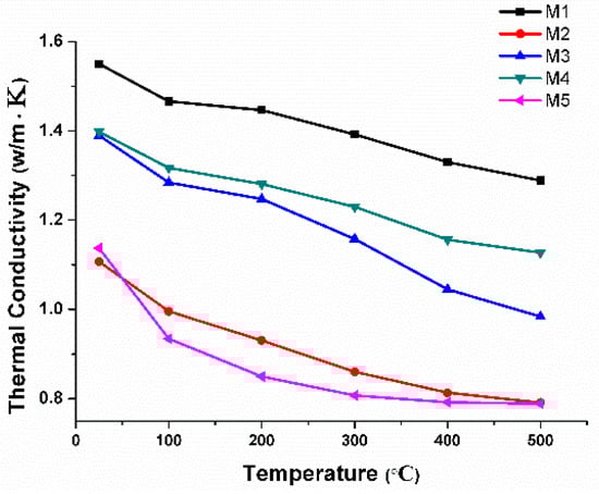 The overall porosity, pore area, and the number of pores of each sample are presented in Table 3. Further, the thermal conductivity of each sample at different temperatures from 25 to 500 °C is shown in Figure 2. The overall porosity of samples is not very different, ranging from 6.15% to 9.58%. However, the thermal conductivity of samples at 500 °C varied from about 0.8 W/(m·K) to about 1.4 W/(m·K), meaning that different types of pores with various morphologies have different effects on the decrease in the thermal conductivity.