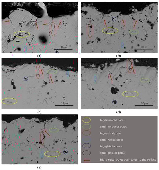 SEM micrographs of cross sections of as-sprayed M1–5 coating (a) M1, (b) M2, (c) M3, (d) M4, (e) M5. Different types of pores are circled with different colors, the arrows mark the position of the big-vertical pores which pass through to the surface.