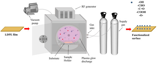 Low-density polyethylene (LDPE) has become one of the most extensively used commodity polymers in various technological applications, such as adhesives, microelectronics, coatings, thin-films, catheters, medical implants, and orthopedic devices [1,2,3,4,5,6,7]. Its versatility is mainly attributed to its outstanding material properties, including low density, ease of finishing, durability, flexibility, and chemical resistance, as well as its current commercial availability. Although the bulk properties of LDPE comply with various mechanical and thermal requirements, its surface properties are undesirable. The LDPE surface is characterized by a low surface free energy that results in poor wettability, adhesion and biocompatibility, making it unsuitable for several applications [4,7,8,9,10]. Surface free energy (wettability) of LDPE achieves values about 30 mJ/m2. However, for applications such as printing or lamination processes, surface free energy is required to be greater than 37 or 42 mJ/m2, respectively [11]. Moreover, untreated LDPE has a predisposition to a biofouling effect. When pristine LDPE is implanted in a biological environment, biofouling is most likely to occur as a result of poor biocompatibility [12]. To overcome similar issues, there has been a longstanding interest to chemically or physically modify and control the surface properties of polymeric materials by incorporating polar groups onto the surface to enhance hydrophilicity, adhesion, and biocompatibility characteristics [2,13,14]. The incorporation of new polar functionalities onto the polymer surface can be performed using wet chemical methods by acid etching or chemical oxidation. Nevertheless, practical use of those methods is complex and environmentally unfriendly as it requires handling and disposal of harmful chemicals. Therefore, for ecological requirements, different technologies have been developed to replace wet finishing processes in several domains to modify the surface properties of polymeric films without generating harmful wastes [15]. Low pressure reactive gas glow discharge, known as cold plasma, technology, is prevalently utilized to enhance the surface properties of polymers by changing the chemical composition and morphology [16]. Its usage has become one of the most versatile and effective means for surface modification applied throughout the food industry, physics, chemistry, material science, and medicine [17]. Several other surface modification strategies include flame, UV, and direct fluorination [18,19,20,21,22,23]. However, plasma technology has gained more preference over other techniques because it represents an alternative effective, clean, dry, economical, and environmentally friendly method. Another distinctive attribute of this technique is easy and fast processing, as the surface treatment is achieved in a single step without requiring further surface treatments. Apart from surface modification, plasma is enormously employed for cleaning, decontamination and sterilization applications [16].