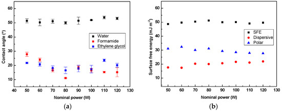 Surface wettability of low-density polyethylene (LDPE) as a function of nominal power for LDPE modified using air plasma for 60 s: (a) contact angle; (b) surface free energy (SFE).