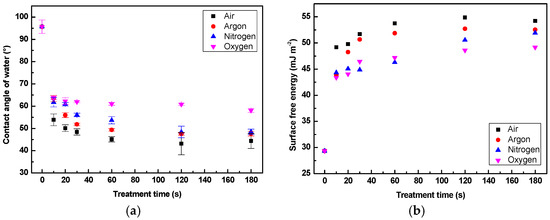 Surface wettability of LDPE as a function of plasma treatment time for LDPE treated using different gases: (a) contact angle of water; (b) surface free energy (SFE).
