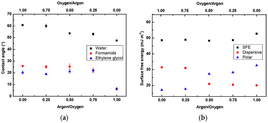 Surface wettability of LDPE treated using argon/oxygen plasma for 120 s as a function of gas concentration ratio: (a) contact angle of water; (b) surface free energy (SFE).