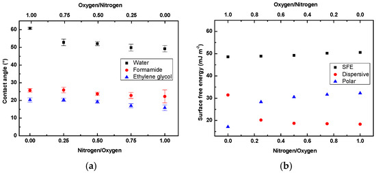 Surface wettability of LDPE treated using nitrogen/oxygen plasma for 120 s as a function of gas concentration ratio: (a) contact angle; (b) surface free energy (SFE).