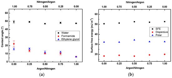 Surface wettability of LDPE treated using argon/nitrogen plasma for 120 s as a function of gas concentration: (a) contact angle; (b) surface free energy (SFE).