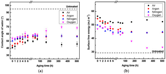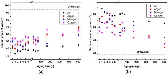 Surface wettability of LDPE treated for 120 s using different gases and stored in ambient air: (a) contact angle; (b) surface free energy (SFE).