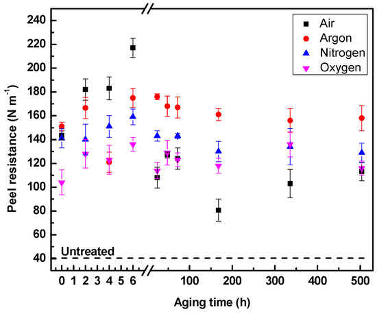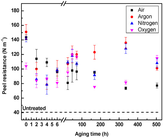 Peel resistance of LDPE treated for 120 s using different gases and stored in air.