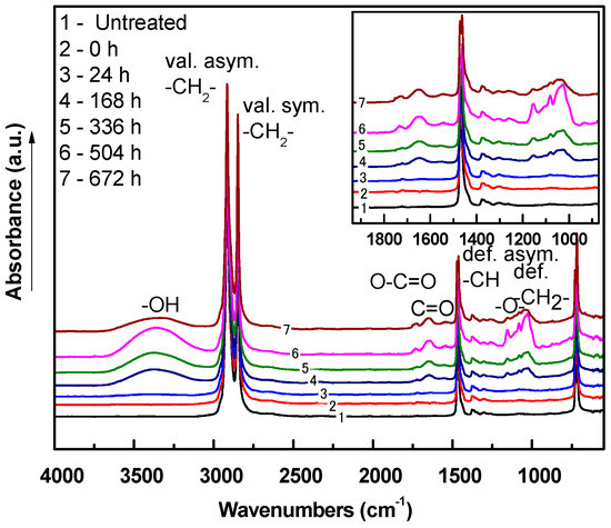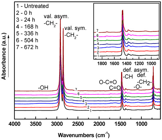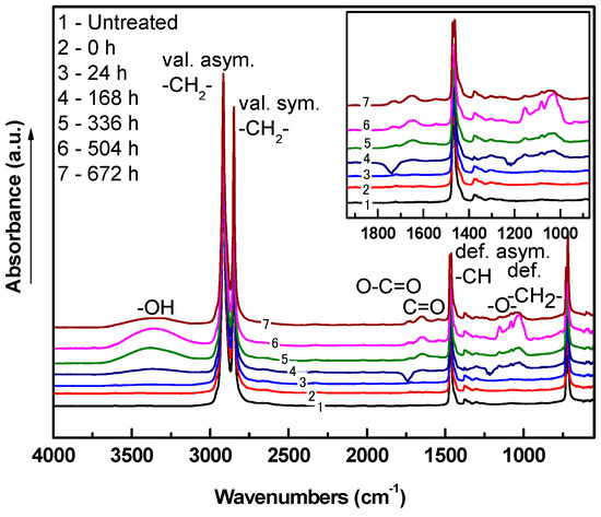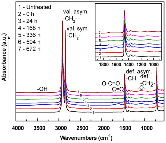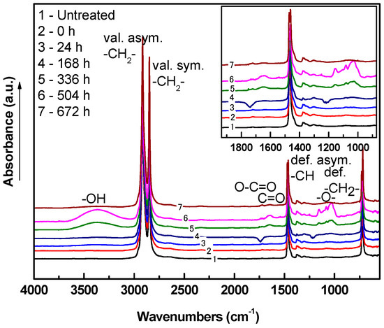 FTIR-ATR was used to analyze chemical composition changes of LDPE after plasma treatment. The IR spectrum of untreated LDPE contains mainly –CH stretching, bending and rocking vibrations in the regions of 2900–2800, 1500, 600 cm−1, respectively, since LDPE contains only hydrocarbon chains. Etching caused by plasma occurred at the nano-level, and thus the similarities between these infrared spectra radiation could not show the high intensity peaks of the new functional groups, as the graphs below showed. These nano-level changes were reflected in subsequent contact angle and XPS analyses. Some oxygen containing groups, for example, oxygen containing products at the surface of the polymer that appeared after 24 h of aging, show absorbance bands associated with vibrations of C=O or C=O in carboxyl group (in region 1800–1500 cm−1) and C–O vibration (1200 cm−1). Moreover, the absorbance band related to the vibration of –OH (wide absorbance band in the 3000–3500 cm−1 region) was observed after plasma treatment. The oxidative reaction plasma treated LDPE films led to changes in FTIR-ATR spectra with aging time (Figure 12, Figure 13, Figure 14, Figure 15, Figure 16, Figure 17, Figure 18 and Figure 19). The increased intensity in absorbance bands centered approximately at 3500 and 3250 cm−1 was likely caused by increased hydroperoxide decomposition in LDPE after aging effects. The increase in intensity centered at 1630 cm−1 was associated with carbonyl species originating from hydroperoxide decomposition because of radical reactions of polyethylene (PE) with oxygen [47].