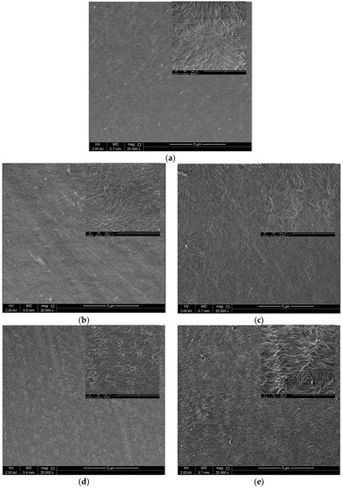 SEM images at 20000× magnification of LDPE films: (a) untreated; (b) treated in oxygen; (c) treated in nitrogen; (d) treated in argon; (e) treated in air.