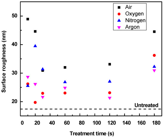 Surface roughness of plasma treated LDPE using air, oxygen, nitrogen, and argon.