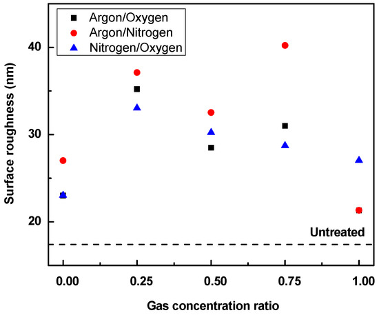 The hydrophilicity using gas mixtures, namely, argon/oxygen and nitrogen/oxygen plasma, as shown in Figure 4 and Figure 5 has slightly increased from those treated with pure oxygen upon increasing either argon and nitrogen concentrations. However, the effect is smaller compared to pure argon and nitrogen. The use of the nitrogen/argon mixture presented in Figure 6 caused only a slight increase in hydrophilicity of such treated LDPE, with a maximum achieved in the case of the use of pure argon. The results show that air plasma has demonstrated the most significant effects on increasing the wettability of the LDPE surface compared to other gases. Plasma treatment time of 120 s at 80 W of nominal power under air provided a minimum contact angle of 43.2° and maximum surface free energy of 54.9 mJ·m−2, representing optimal conditions for plasma treatment of LDPE surfaces. The decrease in contact angle and increase in surface free energy, particularly the polar component, confirm that RF plasma generates hydrophilic surface properties on LDPE within relatively short exposure times, which can be attributed to several factors. Mainly, the formation of new reactive oxygen- and nitrogen-containing functional groups incorporated onto the surface is promoted during the plasma treatment process. Additionally, the LDPE surface is enriched in free radicals immediately after removal from the plasma reactor, which are highly susceptible to atmospheric oxidation upon exposure to air. The other factor affecting hydrophilicity increase is the surface roughness, caused mainly by etching reactions. Moreover, plasma treatment can possibly inaugurate superficial reorientation of the polymer micro-domains, in which the hydrophilic regions are redirected to the surface of the substrate [43]. The effect of the latter factors on surface wettability can be explained in terms of the polarity of the interface. More polar groups result in increased molecular forces, consequently enhancing the interactions between surfaces that are in contact, hence increasing the hydrophilicity of the surface.