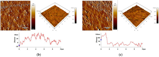 Detailed information about three-dimensional changes in the surface topography of LDPE surface after plasma treatment was obtained using atomic force microscopy (AFM). The AFM device MFP-3D (Asylum Research, Abingdon, Oxford, UK) was used in these experiments. Scanning was carried out under ambient conditions using a silicon probe (Al reflex coated Veeco model–OLTESPA, Olympus, Tokyo, Japan) in the tapping mode in air (AC mode), allowing for obtaining images from 10 × 10 µm2 surface area. Moreover, the roughness parameter value (Ra) was calculated from the AFM images using the Z-Sensor.