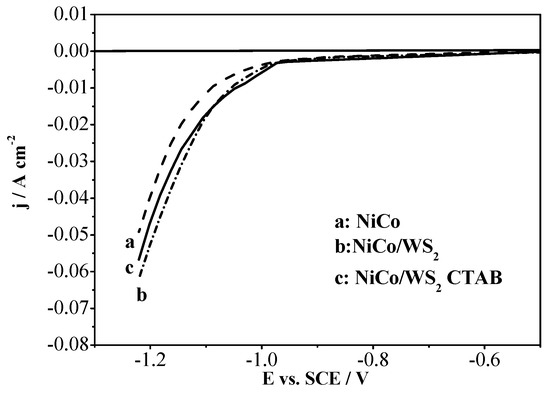 The current density-cathodic potential curves of (state electrode reactions) in Ni–Co and Ni–Co/WS2 electrolytes.