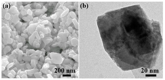 (a) SEM image and (b) TEM image of as-received WS2 particles.