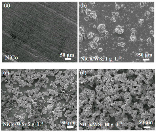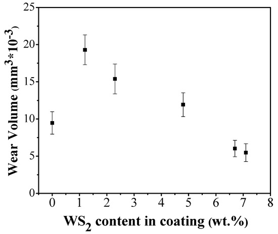 Figure 5b shows that the weight percentage of WS2 particles in coating increases with the increasing of the WS2 concentration in bath, reaching a maximum WS2 content of 7.1 wt.% at a particle concentration of 15 g L−1. There is an optimal particle concentration in this experiment, as a further increase of WS2 concentration leads to particle agglomeration and sedimentation in solution.