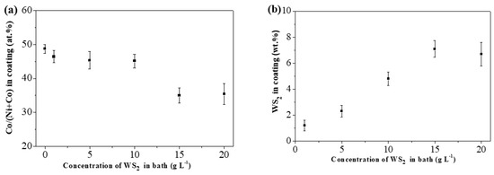 (a) The mol ratio of Co/(Co + Ni) and (b) the content of WS2 particles in coating versus the concentration of WS2 in solution.