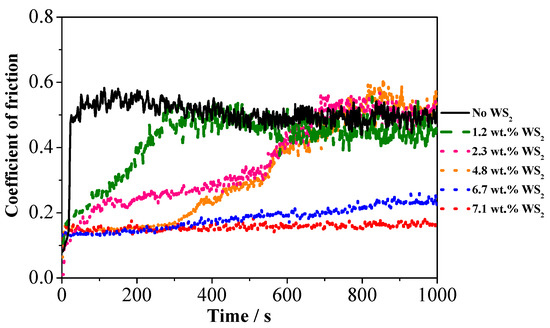Relationship between friction coefficient and sliding time for the Ni–Co/WS2 with different WS2 contents.