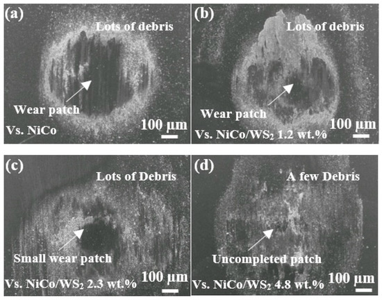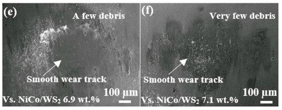 The surface morphology and composition of wear tracks were examined by SEM and EDS respectively. Scoring wear can be found on the pure Ni–Co coating after wear test of 1000 s, as shown in Figure 7. The Ni–Co/WS2 1.2 wt.% composite coating presents a similar wear track surrounded by lots of debris particles. It is worth noting that the surface protrusions of the electrodeposited coating are fragile and easily fractured during the friction process. With the increasing of WS2 content in coating the wear gradually became less severe and finally changed to galling in the case of Ni–Co/WS2 coatings with WS2 content 2.3 wt.% and higher. The wear degree of the Ni-Co/WS2 coating decreases with the increase of WS2 content in coating. The Ni–Co/WS2 7.1 wt.% sample shows only a narrow abrasive wear track with few debris particles. As listed in Table 1, the wear track of Ni–Co coating is composed of 22.1 wt.% Ni, 21.9 wt.% Co, 23.0 wt.% O and 33.0 wt.% Fe. The wear track of the Ni–Co/WS2 7.1 wt.% sample contains a higher WS2 content than that of the resting area on the coating, suggesting that WS2 has a high adhesion ability to the sliding surface. The wear track of the Ni–Co/WS2 7.1 wt.% sample shows a smaller oxygen content of 1.8 wt.% compared to that of pure Ni–Co coating. On the one side, the release of WS2 from the coating matrix reduces frictional heat on the mating surfaces, and on the other, the formation of compact WS2 rich tribofilm separates the coating from the air. These two effects lead to a low degree of oxidation.