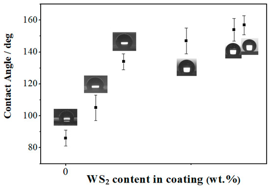 The wetting properties of electrodeposited surfaces are determined by the water contact angle test. As seen in Figure 10, the pure Ni–Co coating has a low WCA of 85°. With the WS2 content increasing, the WCA of the Ni–Co/WS2 coating significantly increases. The Ni–Co/WS2 7.1 wt.% coating shows an excellent superhydrophobicity as indicated by a high WCA of 156.9 deg.