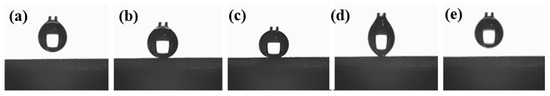 (a–e) Photographs illustrating water droplet does not adhere to the Ni–Co/WS2 7.1 wt.% surface: (a) a needle with suspended water droplet is set on the top of the Ni–Co/WS2 coating; (b) the water droplet touches the surface of the coating with a low approaching velocity; (c) the water droplet become rounder as the needle further approach; (d) the water droplet is deformed heavily when the needle is separating from surface; (e) the water droplet is away from the coating after separation.
