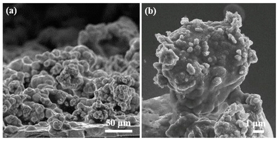 As well known, surface wettability is determined by chemical composition and surface structure, and can be described by either the Wenzel [24] or Cassie–Baxter model [25]. The Ni–Co surface has a WCA below 90° and is intrinsically hydrophilic. According to Wenzel’s model, the wettability of intrinsic hydrophilic surface should be enhanced as the roughness increases, which is obviously not applicable for the electrodeposited Ni–Co/WS2 coatings. Cassie–Baxter’s model is commonly used to predict the hydrophobicity when air is trapped between the solid surface and the liquid droplet. The Ni–Co/WS2 surfaces have a double-rough structure consisting of submicron asperities on micron-scale protrusions as illustrated in Figure 12; therefore, when these coatings are subjected to a liquid droplet, air bubbles are trapped and retained within asperities on the surface, maintaining the hydrophobic Cassie–Baxter state. The dual scale roughness has already been applied as the most commonly used criterion for superhydrophobic solid surface in the Cassie–Baxter state [26].