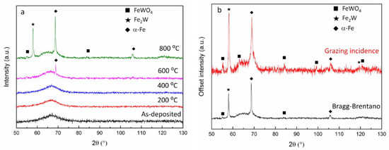 X-ray diffraction patterns of Fe-24W alloys annealed at different temperatures (a), and X-ray diffraction patterns of Fe-24W sample annealed at 800 °C acquired with Bragg–Brentano and grazing incidence geometry (b).