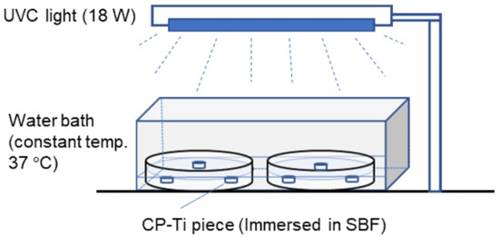Immersion testing of CP-Ti pieces was carried out under UV light irradiation as schematically shown in Figure 1. A Tris-HCl buffered SBF containing 27 mM HCO3− was used. The composition of the SBF is 142 Na+, 125 Cl−, 27 HCO3−, 5 K+, 1.5 Mg2+, 2.5 Ca2+, 1 HPO42−, and 0.5 SO42− (mM/L). 0.8 g/L bovine serum albumin (BSA) was added to the SBF to simulate human plasma. An 18 W Hg UVC lamp (KADIND, Shaoxin, China) with a 303 mm length was used as light source. The UVC lamp was hung 150 mm above table. An irradiation pattern of 4 h UVC lighting and 20 h dark was set for one daily period. Att [9] has reported that an aged titanium in dark condition has inferior bioactivity to UV light activated titanium. However, the reactivation of the aged titanium promotes more bioactivity. We utilized this lighting/dark pattern to attempt to produce more deposition on CP-Ti. The surfaces of CP-Ti pieces were irradiated repeatedly for 15 days. A dark environment was realized by covering the glass dishes and covering the water-bath with a black cover.