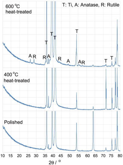 X-ray diffraction spectra of CP-Ti specimens after mechanical polishing, and 400 and 600 °C heat treatment, before immersion.