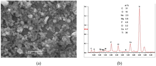 Figure 7a shows further a SEM micrograph of the deposition on the thin thickness areas treated with UV light irradiation. Two kinds of particles—rod-shaped and cube-shaped—were found. The EDS detection of the rod-shaped particles (Figure 7b) denotes that it contains mainly C, O, Ti, Na, Cl, Ca and P elements. Because the electron beam size used in EDS examination (2 μm) exceeds the size of the rod-shaped particles, the elements should include those both in the rod-shaped and in the cube-shaped particles. It will be demonstrated later that the cube-shaped particle are the crystals of salt. Consequentlythe rod-shaped particles are composed of C, O, Ti, Ca and P. The N element included in BSA was removed from the deposition due to the photocatalysis-causing deamination. The Ca and P elements were precipitated from SBF solution. Histograms of the length and width of particles are shown in Figure 7c,d respectively. According to the histograms the length and width of the rod-shaped particles are estimated to be around 1.4 and 0.67 μm, respectively. The cube-shaped NaCl crystals are 1–4 μm in size. Large NaCl crystals of around 50 μm were also found.