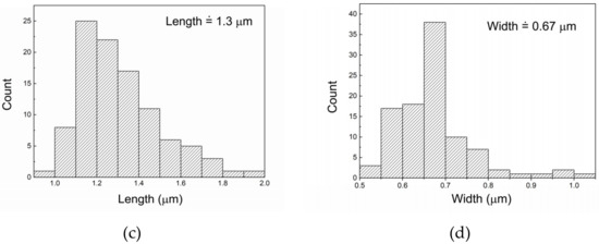 SEM micrograph of the deposition produced by immersion with UV light irradiation (a) heat treated surface at 400 °C, (b) EDS analysis of the rod particle and (c) histograms of length distribution and (d) wider distribution of rod-shaped particles. Length and width are measured on 100 randomly selected rod-shaped particles.
