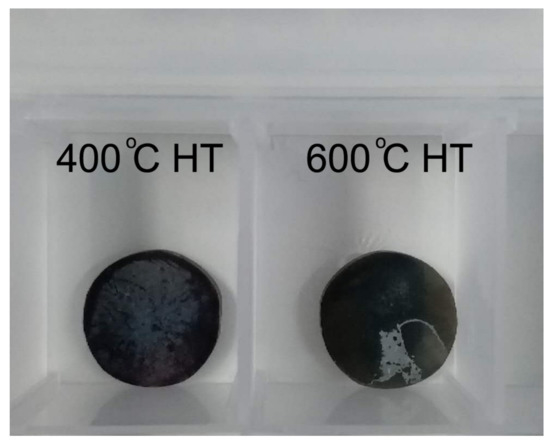 The stability of the deposition layer generated was checked by a test of ultrasonic vibration. A 40 kHz frequency ultrasonic treatment lasting 5 min was used to attempt to damage the deposition when the pieces were soaked in distilled water. The results are shown in Figure 8. It can be seen that except for a little layer separation the rest of the deposition remained complete on the 600 °C HT surface. The deposition on the 400 °C HT pieces remained totally complete. These results explain the higher stability of the deposition produced on heat-treated CP-Ti under UV light irradiation.