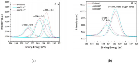 Figure 9 shows high resolution XPS of C1s, O1s, Ca2p and P2p for the specimens with UV light irradiation. These spectra have been corrected by assuming a standard C–C peak at 284.8 eV. The spectra of C1s are deconvoluted into three sub-peaks as shown in Figure 9a. According to the bonding energy of C1s [27], C–H, C–C and C–O correspond to three peaks at 286.7, 284.8, and 283.4, respectively. Furthermore, it can be observed semi-quantitatively that the intensity of C–H bonds deposited on the 400 and 600 °C HT surfaces is much lower than that deposited on the polished surfaces. By contrast, the intensity of C–C peaks shown on the HT surfaces is higher than that for the polished surfaces. Particularly, a wider C–C peak for 600 °C HT surfaces can be seen indicating larger production of C–C by 600 °C HT. Near the same intensity of C–O peaks for the three types of surfaces was identified.