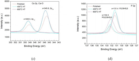 The O1s spectra (Figure 9b) can be deconvoluted into two sub-peaks: metal-oxygen bonds at 529.8 eV and C–O and P–O bonds at 531.4 eV. Figure 9b shows that the intensity of the metal-oxygen bond on the 400 °C HT surfaces is the largest among the three types of specimens, whereas the largest intensity of organic forms of oxygen bonds occurs for the 600 °C HT surfaces. The Ca2p spectra (Figure 9c) show spin-orbit splitting at 2p1/2 and 2p3/2 at the bonding energies of 345.8 and 349.3 eV, respectively. They both indicate the formation of a Ca–O bond. Also by observed from the peak intensity it is semi-quantitatively described that the larger Ca–O bond is produced on the HT pieces. The P2p spectra (Figure 9d) are deconvoluted into two sub-peaks at 131.4 and 132.3 eV. With regard to the XPS NIST (National Institute of Standards and Technology) [27] database, these two peaks correspond to PO(C6H5)3 and P(C6H5)3 bonds, respectively. There is larger deposition of PO(C6H5)3 and P(C6H5)3 bonds on the HT pieces than on the polished surfaces. Large increment of PO(C6H5)3 bonds on the 600 °C HT surface is noticed compared to other two types of surfaces.