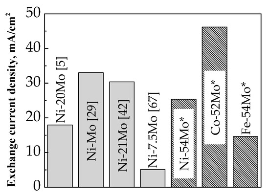 In general, the present study shows the catalytic activity for the Ni–Mo alloy is comparable to previously reported samples under similar experimental conditions (Figure 5). Moreover, in the case of the Co–Mo and Fe–Mo system, the apparent exchange current density calculated in our work is significantly higher than it was expected from other authors observations (the corresponding columns are not given in the figure due to a significantly lower value). This could be attributed to the more concentrated alkaline media and higher temperature used in the present study.