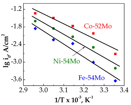 - Bimetallic Mo-based alloys are considered as more active for the HER in comparison with the cast Mo and Pt since they demonstrate higher apparent exchange current densities in the tested temperature range. The apparent exchange current density of hydrogen for Co–52 at.% Mo deposits were considerably higher than those for Ni–54 at.% Mo and Fe–54 at.% Mo alloy coatings and this can be attributed to the formation of stable intermetallic Co3Mo phase which ensures optimal Co and Mo distribution over the surface and produces larger active sites for the HER.