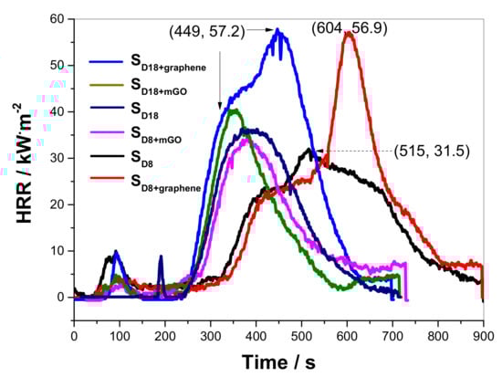 - The CC results determine that there is an obviously antagonistic effect on flame retardancy between graphene and graphite doped APP–PER–PR-based coatings, evidenced by the increased p-HRR of 56.9 kW·m−2 for SD8+graphene (increased by 80.6% compared with SD8). Substitution with graphene or mGO imparts an acceleration of FGI to the graphite doped APP–PER–PR-based coatings.
