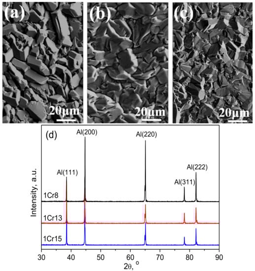 After the same procedures of surface preparation and plating pretreatment, Al coatings were electrodeposited on three types of Cr steel substrates. As shown in Figure 2a–c, dense Al deposits formed on Cr steel samples without observable defects, such as voids and cracks, after 1 h of IL plating. Similar surface morphologies of Al layers could be observed on different Cr steel substrates. However, the corresponding XRD patterns were a little different, as shown in Figure 2d. For 1Cr8 steel, peaks (200) and (220) were the most prominent, while for 1Cr13 and 1Cr15 steels, they were peaks (111) and (200). Nevertheless, no preferential growth of Al grains was obviously observed in these Cr steels, as earlier reported on 321 steel workpieces [25]. Moreover, prior to Al electrodeposition, no obvious orientation existed in these three steels either (Figure 1). By comparison, 321 steel has a different crystal structure (face-centered cubic (FCC)) and metallographic phase (austenite) with a higher Cr content (18.0 wt%), while the Cr steels used in this work are BCT- (1Cr8, 1Cr13) or BCC-structured (1Cr15) and martensitic- (1Cr8, 1Cr13) or ferritic-phased (1Cr15). Therefore, it could be inferred that the difference in material properties, including crystal structure, metallographic phase, and alloying element content, for different steel substrates could have resulted in the difference in Al coatings shown in Figure 2d. The property difference of Cr steels may also have affected the electrodeposition efficiency, nucleation, and growth mechanism of Al layers on different substrates. In a word, Cr steel substrates themselves may have an impact on the Al electrodeposition process.