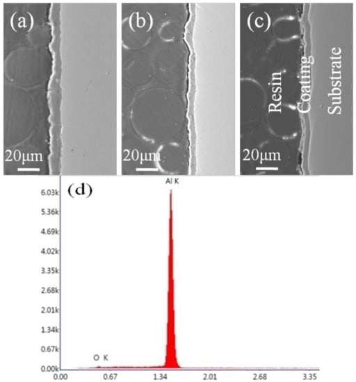 The cross-section features of Al coatings formed on Cr steel substrates are shown in Figure 3a–c. Continuous pure Al (Figure 3d) layers with average thicknesses of 5.0 ± 0.6–12.5 ± 0.9 μm were observed, showing that Al layers were well adhered to steel substrates. Similarly to Figure 2, a slight difference could be found for the topography of formed Al layers in Figure 3. However, remarkable discrepancies occurred in the thickness of Al layers. The average Al thickness formed on 1Cr8 steel (~12.5 μm) was about two times larger than 1Cr15 steel (~5.0 μm). Moreover, the average Al thicknesses were arranged in an order of 1Cr8 > 1Cr13 > 1Cr15, as if the Al thickness decreased with the Cr content in steel substrates. Since the same surface pretreatment was conducted to obtain a similar surface condition, including roughness, for the three types of Cr steel samples before plating, and the Al coating parameters were also identical, the thickness of as-deposited Al layers should have thus only been affected by properties of steel substrates. The differences in material properties in Cr steels would have caused a variation in Al electrodeposition efficiency on different substrates, leading to inhomogeneous thicknesses of Al layers formed. It may have been a coincidence that the thickness of the electrodeposited Al layer was reduced with increasing Cr content, which may have originated from the crystal structure and metallographic phase of steels, since Cr was not involved in the process of electrodeposition (Figure 3d). In a word, it is certain that the steel substrate had an influence on the process of Al electrodeposition.