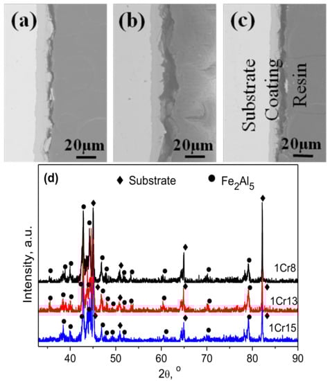 Cross-section images of aluminide coatings formed on Al deposited (a) 1Cr8, (b) 1Cr13, and (c) 1Cr15 steel substrates and (d) the corresponding XRD patterns after 500 °C, 4 h heat treatment in vacuum.