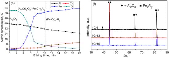 Depth profiles of (a) Fe, (b) Cr, (c) Al, (d) O, and (e) the relative atomic contents for scales formed on aluminide 1Cr13 steel; and (f) XRD patterns for aluminide coatings formed on Cr steel substrates after 700 °C, 120 h selective oxidation in an Ar gas stream.