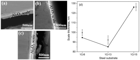 Cross-section features of scales formed on aluminized (a) 1Cr8, (b) 1Cr13, and (c) 1Cr15 steel samples after 700 °C, 120 h selective oxidation in an Ar gas stream, and (d) the corresponding scale thicknesses determined by a reflection spectrum (RS) (the error bar is enlarged by about 10×).
