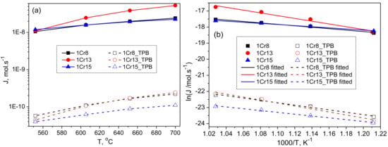 After coating with aluminide TPBs, the deuterium permeation flux at 552–700 °C of each Cr steel sample was remarkably reduced, up to two orders of magnitude, as shown in Figure 7a, indicating that the prepared aluminide TPBs were effective in deuterium permeation resistance, which could be attributed to the formation of outer scales. Generally speaking, for FeAl/Al2O3-type aluminide TPBs, the hydrogen PRF of an outer Al2O3 scale under a convenient service condition is much higher than that of the inner transition FeAl layer, which has been verified both in experimental and theoretical studies [1,43]. From the view of PRF, the deuterium PRF for 1Cr8 steel samples at 552, 605, 652, and 700 °C were 185, 144, 118, and 110, respectively; for 1Cr13 steel samples, they were 250, 233, 226, and 218; and for 1Cr15, they were 300, 240, 220, and 204. In contrast, the deuterium permeation resistance of aluminide TPBs on 1Cr8 steel samples was much less effective than that on 1Cr13 and 1Cr15 steel samples at the same temperatures. For the last two types of Cr steels, the deuterium permeation resistance of aluminide TPBs on 1Cr13 steel samples was not as effective as that on 1Cr15 steel samples at temperatures lower than 605 °C, while at temperatures higher than 605 °C, opposite results emerged. On the other hand, after coating with aluminide TPB, the deuterium permeation activation energies were 61.27, 77.16, and 46.98 kJ/mol for 1Cr8, 1Cr13, and 1Cr15 steels by the Arrhenius fittings, respectively, much higher than for uncoated ones, also showing the permeation resistance of aluminide TPBs. It thus can be seen that there were significant divergences in the deuterium permeation resistance of aluminide TPBs on different Cr steel substrates. That is, the substrate effect existed in aluminide TPBs, exerting an influence on the deuterium permeation resistance.